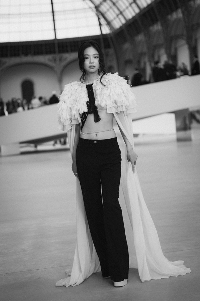 제니는 2025 봄-여름 레디-투-웨어 컬렉션 룩 72번의 탑, 케이프와 2024/25 공방 컬렉션 룩 72번의 울 팬츠 및 2024/25 공방 컬렉션의 후크가 달린 클래식 미니 백, 2025 봄-여름 레디-투-웨어 컬렉션의 네크리스를 벨트로 활용한 룩을 완성해 매혹적인 실루엣을 뽐냈다.
