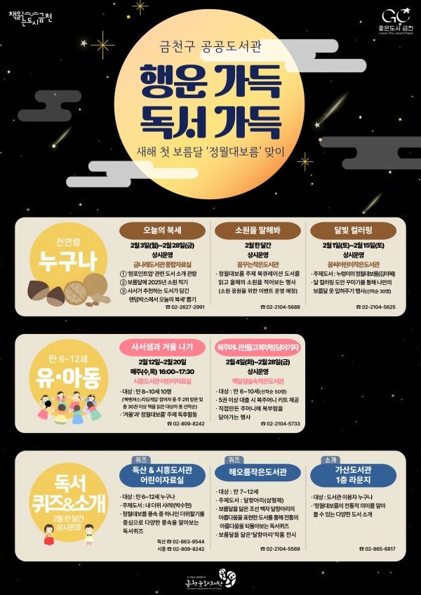 금천문화재단은 정월대보름을 맞아 금천구 공공도서관에서 다채로운 독서·문화 체험 행사를 운영한다. 정월대보름의 의미를 알아보고, 전통과 현대의 조화를 경험해 전통의 가치와 의미를 느낄 기회를 지역에 제공하기 위함이다.