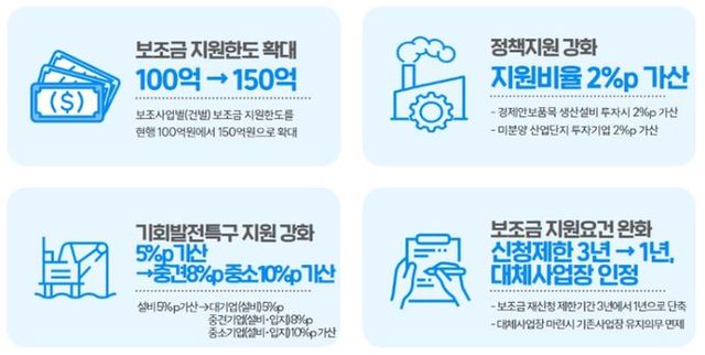 지속적인 대규모 민간투자를 유도하기 위해 지방투자보조금 사업별(건별) 한도를 기존 100억원에서 150억원으로 확대하며, 특히 기회발전특구 중심의 신규 프로젝트 유치를 위해 기회발전특구에 투자하는 중견 ‧ 중소기업에 대한 보조금 지원비율 가산율을 기존 5%p에서 각각 8%p, 10%p로 상향 할 계획이다.
