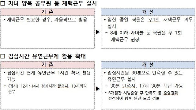 임신 중인 공무원에게 주 1회 재택근무를 의무화하고, 8세 이하 자녀를 둔 육아기 공무원도 주 1회 재택근무를 권장한다. 8세 이하 자녀를 둔 공무원을 대상으론 주 1회 재택근무 권장 단계로 시작하지만 제도 운영 과정에서 의무화를 검토할 예정이다.