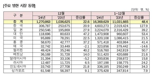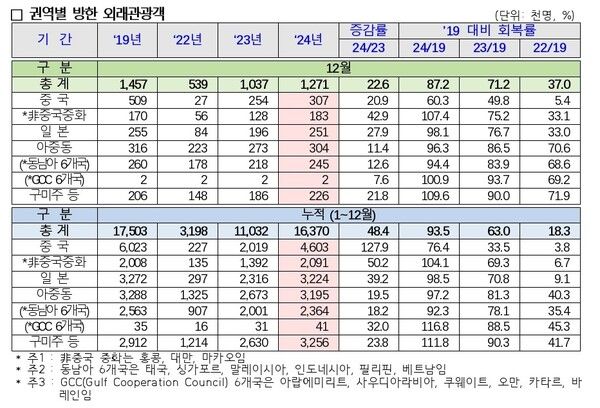 12월 방한객은 1,270,863명 전년 동월(1,036,625명) 대비 22.6% 증가하고 2019년 동월의 87% 수준 회복했다.