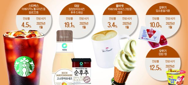 대상은 지난 16일 청정원 마요네즈, 드레싱 등 소스류 제품과 후추 가격을 평균 19.1% 인상했다. 오뚜기는 앞서 업소용 딸기잼 가격을 최대 10% 올린 데 이어, 다음 달엔 컵밥 7종의 편의점 가격을 12.5% 인상할 계획이다.