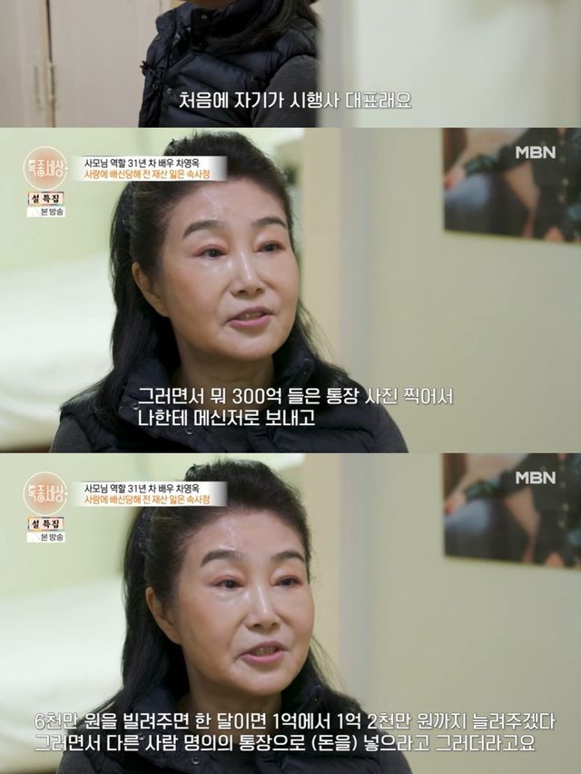 차영옥은 "자기가 시행사 대표라면서 300억 든 통장 사진을 내게 보내더라. 1억씩 다달이 들어온다고 하고 돈이 많다는 표현을 한다"며 전 연인에게 사기를 당했음을 밝혔다.