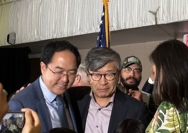 지난해 11월 5일(현지 시각) 미국 대통령 선거와 함께 치러진 연방 상·하원 의원 선거에서 앤디 김(왼쪽) 상원의원의 당선이 확정된 순간 미국 뉴저지주 체리힐의 더블트리 호텔에서 진행된 기자회견장에서 축하해 주고 있는 김동석 KAGC 대표. / KAGC·연합뉴스