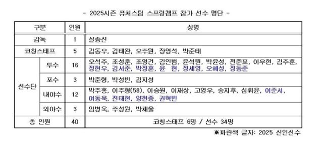 설종진 2군 감독을 포함한 코칭스태프 및 선수 40명은 2일 오후 2시 15분 인천공항 1터미널에서 에어로케이 RF515편을 이용해 대만 가오슝으로 출국한다. 이번 2군 캠프 참가 명단은 왼손 유망주 정현우를 포함해 2025 신인 드래프트에서 지명된 12명 등 저연차 선수 중심으로 구성됐다. 캠프 기간 개인 기량 강화를 목표로 기본기 훈련에 집중할 예정. 실전 감각을 쌓기 위한 연습경기도 계획돼 있다.