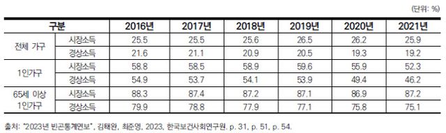 문제는 노인·1인가구가 늘어나는 추세와 맞물려 이들의 빈곤율도 심화되고 있다는 점이다. 처분가능소득을 적용한 노인빈곤율은 2023년 38.2%로, 공적이전과 조세 및 사회보장부담금을 모두 고려한 경우에도 전체 빈곤율(14.9%)의 약 2.6배에 달했다. 1인가구의 빈곤율도 전체 빈곤율에 비해 갑절 이상 높게 나타났는데, 고령인구 중 1인가구 비중이 36.4%를 차지할 정도로 큰 상황에서 노인빈곤율이 다른 연령대에 비해 상대적으로 높은 데 기인했다는 해석이다.