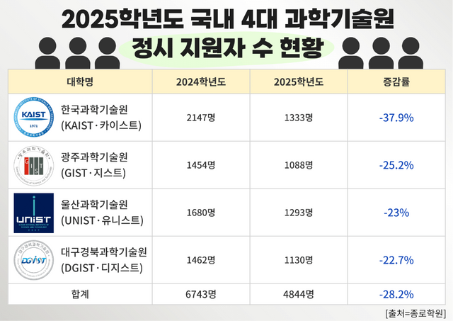 반면 의대를 제외한 나머지 자연계열 학과 지원자 수는 급감했다. 일례로 올해 우리나라를 대표하는 이공계 특성화대학 한국과학기술원(KAIST·카이스트)의 지원자 수는 총 1333명으로 지난해(2147명)에 비해 약 38% 줄었다. 이어 ▲광주과학기술원(GIST·지스트) ▲울산과학기술원(UNIST·유니스트) ▲대구경북과학기술원(DGIST·디지스트) 등을 포함한 4대 과학기술원(이하 과기원)의 전체 정시 지원자 수도 전년(6743명) 대비 28% 가량 감소했다.