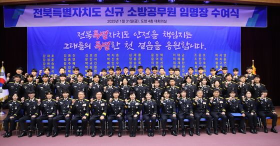 전북특별자치도소방본부(본부장 이오숙)는 31일 전북도청 4층 대회의실에서 ‘2025년 신임 소방공무원 임용식’을 개최했다. 이번 임용식에서는 6개월간의 전문 교육과정을 성실히 마친 52명의 신임 소방공무원이 임명장을 받고 새로운 소방관으로서의 첫걸음을 내디뎠다.
