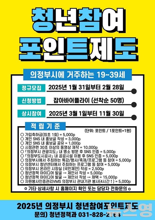 (뉴스영 이현정 기자) 의정부시는 청년들의 다양한 사회활동 참여를 독려하고자 ‘2025년 청년참여포인트제도’를 운영한다.
