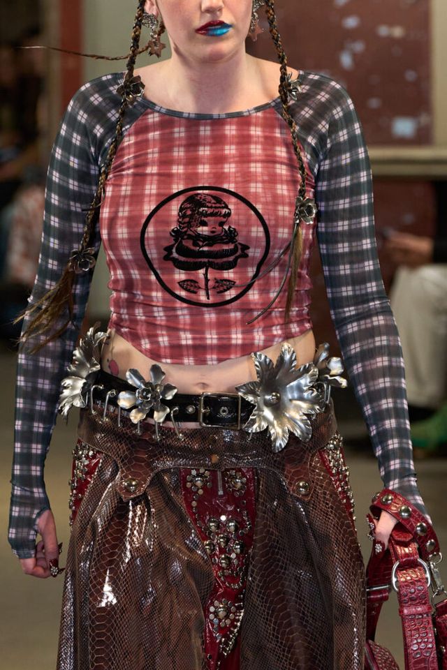 초포바 로위나는 벨트에 입체적인 금속 장식을 더해 드라마틱한 매력을 발산했습니다. 플라워 모티프가 더해진 벨트는 강렬한 패턴의 레이어링 위에 톡톡 튀는 감초처럼 존재감을 드러내며 만개했습니다. 초포바 로위나 특유의 펑크 무드를 더욱 극대화했죠.