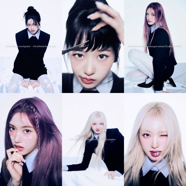 안유진은 가위로 앞머리를 자르는 듯한 연출로 시선을 사로잡았고, ‘A bad haircut is no big deal-it’ll still look like my style’(잘 못 자른 머리도 상관없어-이건 여전히 내 스타일이야)이라는 문구가 적혀 있어 아이브의 당당한 애티튜드를 강조했다. 이서는 얼굴에 크림을 묻힌 채 카메라를 응시했다. ‘If the cake I worked hard on gets ruined, I‘ll just play with it’(열심히 만든 케이크가 망가진다면, 그냥 갖고 놀래)라는 문구는 돌발 상황을 유쾌하게 넘기는 태도를 나타냈다. 리즈는 입에 퍼즐 조각을 물거나 트레이드 마크인 금발을 휘날리며 미소를 보였고, ‘Even what’s unfinished can be considered complete’(완성되지 않은 것도 완성이라고 할 수 있어)라고 적혀 있어 긍정적인 사고를 제안했다.