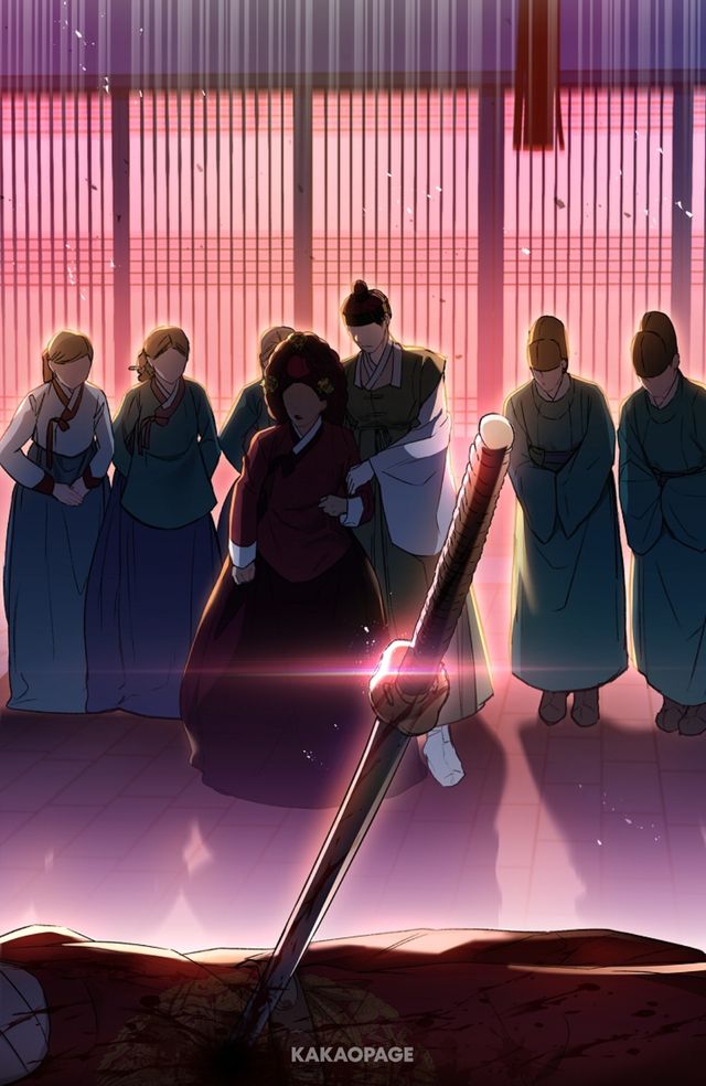 중전으로 보이는 한 여자가 칼이 박힌 임금 앞에 서 있고,