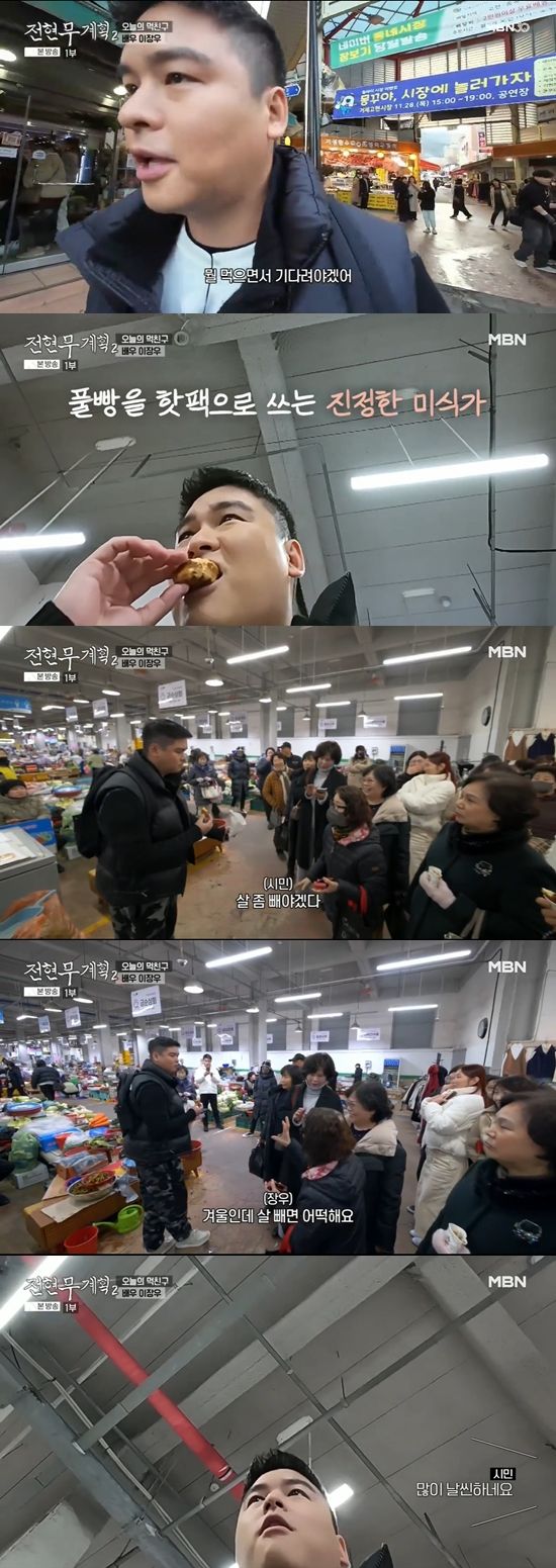 이날 이장우는 전현무와 곽튜브(본명 곽준빈)를 만나기 전 혼자 시장을 들렀다. 그는 "여기 시장에 먹을 거 많이 팔텐데"라며 풀빵을 사먹는 모습을 보여줬다.