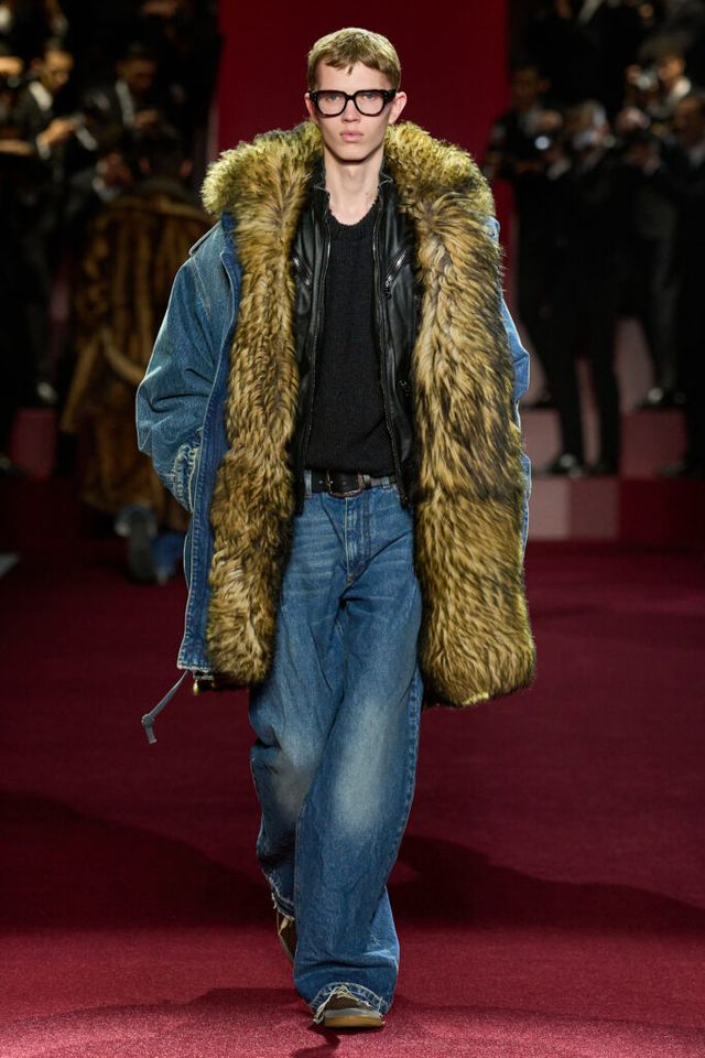 돌체 앤 가바나 쇼에서는 레드 카펫 위를 걷는 배우 같은 모델들이 수많은 파파라치의 플래시를 받으며 등장했죠. 가장 많은 플래시를 받을 것 같은 베스트 룩은 헐리우드 배우들의 리얼 웨이 승타일을 담은 화려한 퍼 장식 룩인데요. 아우터의 데님, 이너로 착용한 레더, 퍼디테일 등 서로 다른 소재를 대담하게 믹스매치한 스타일로, 스트리트와 럭셔리의 경계를 허문 디자인이 돋보였습니다. 여기에 굵은 테의 안경은 스트리트 감성에 지적인 매력을 더하는 유쾌한 디테일로 작용했죠. 영화로운 밤을 빛낼 화려한 레드 카펫 룩으로 강렬한 인상을 남겼습니다.