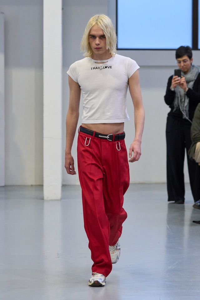 조던 루카 쇼에서는 공동 크리에이티브 디렉터인 조던 보웬과 루카 마르케토의 깜짝 결혼식이 열렸습니다. 이들은 이번 시즌에 ‘사랑’을 주제로 컬렉션을 풀어냈는데요. 클래식 아이템의 변주와 실험적인 실루엣, 사랑에 관한 디테일을 찾는 재미가 돋보였습니다. 베스트 룩으로는 레터링 티셔츠와 하트 펜던트 네크리스, 강렬한 레드 팬츠를 조합한 이 센슈얼한 룩입니다. 크롭 톱과 루즈한 팬츠 실루엣이 과감함과 자유로움을 느낄 수 있었죠. 표현의 자유와 정체성에 대한 사회적 메시지를 담은 레터링 디테일이 키 포인트입니다.