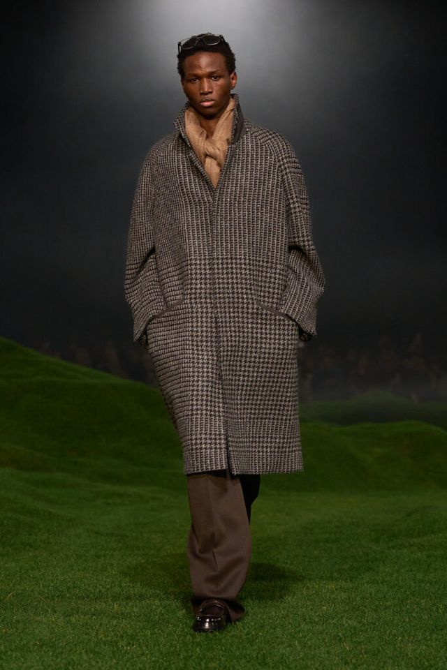 제냐의 쇼는 양들이 자연의 서식지로 돌아가는 영상을 담은 거대한 스크린과 실제 풀로 꾸며진 넓은 들판 속에서 시작되었습니다. 그리스 로마 신화의 황금 양털에서 영감을 받은 이번 컬렉션은 지속 가능한 벨루스 오레움 섬유로 제냐식 럭셔리의 정수를 구현했죠. 특히, 오버사이즈 실루엣에 정교한 테일러링으로 완성한 코트가 돋보였는데요. 따뜻한 소재와 차분한 컬러의 머플러가 룩에 부드러운 포인트를 더하고, 하운드 체크 코트, 브라운 팬츠, 베이지 머플러의 컬러 조합은 품격 있고 세련된 분위기를 자아냈습니다.