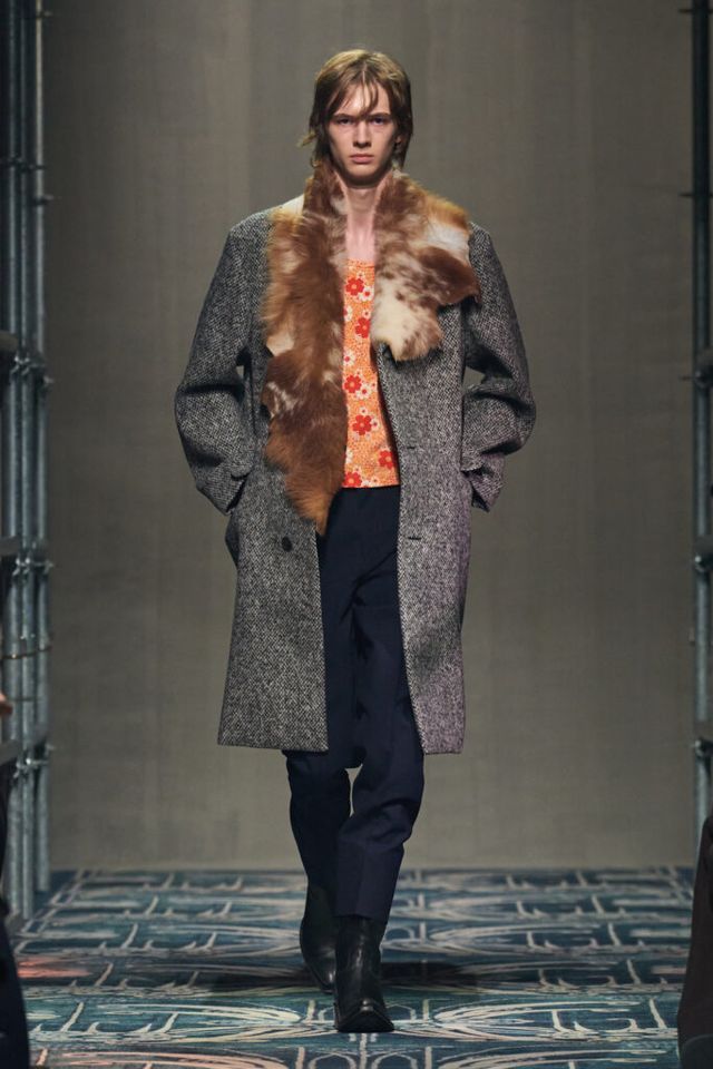 2025 F/W 맨즈 컬렉션에서 주목할 만한 디테일 중 하나는 바로 인조 퍼 디테일입니다. 많은 디자이너들이 퍼 장식을 활용해 와일드하면서도 고급스러운 매력을 선보였는데요. 그중에서도 단연 돋보였던 것은 프라다의 코트 룩입니다. 불균형한 형태의 인조 퍼 칼라를 코트에 더해 원시적이면서도 독창적인 무드를 자아냈습니다. 내추럴한 브라운 퍼와 모노톤 컬러의 코트는 차분하고 조화로운 분위기를 만들어내고, 이너로 착용한 비비드한 오렌지 컬러의 플라워 패턴 톱이 룩에 생동감을 불어넣어 포인트 역할을 톡톡히 했죠. 또한, 톤온톤의 차분한 색조와 대조적인 비비드 컬러의 조합은 프라다 특유의 감각적인 컬러 플레이를 잘 보여주었습니다. 여기에, 아르누보 풍의 카펫 위를 걷는 모델의 모습은 룩의 자유롭고 본능적인 매력을 더욱 부각했습니다.