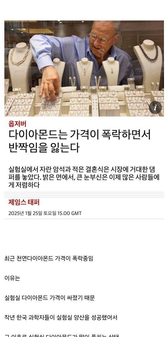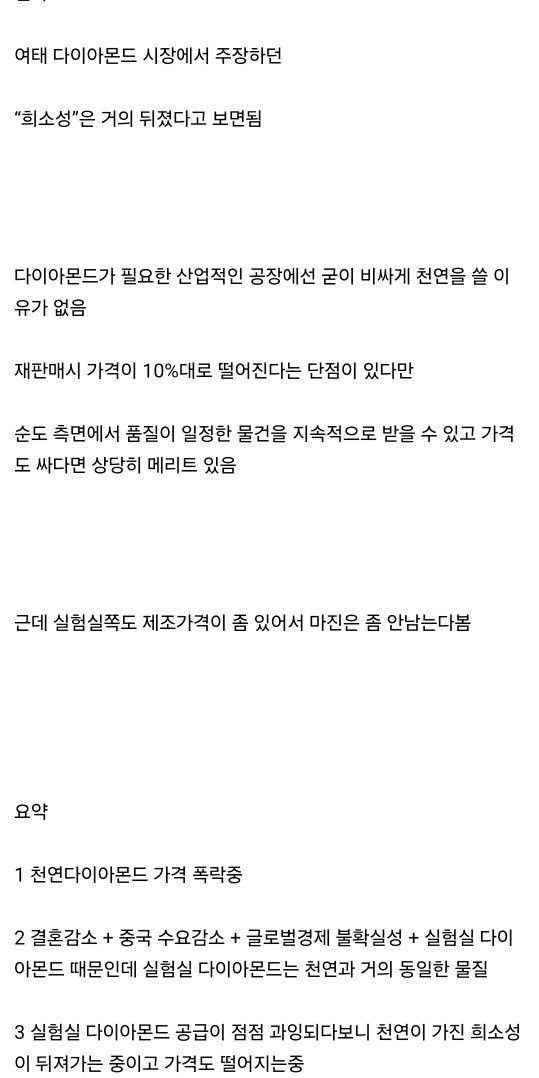 천연과 인공의 가격대를 의도적으로 벌리고 인공 다이아몬드 제작사들을 망하게 하려는 움직임을 보인다고 들었었는데
