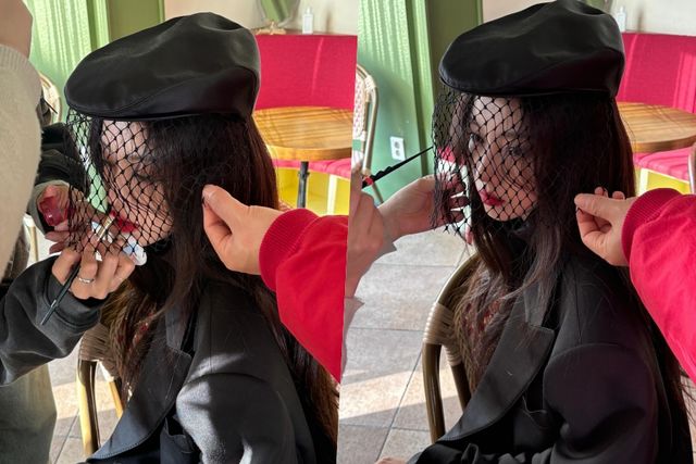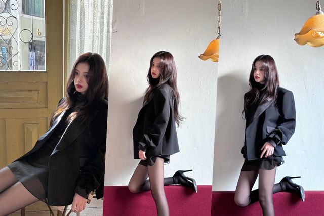 특히 올블랙 색상으로 완성한 패션과 베일 장식이 돋보이는 모자 등을 착용해 고혹적인 매력을 발산한 것은 물론, 시스루 형태로 된 듯한 하의 부분에 그의 가녀린 각선미가 드러나 감탄을 자아냈다.