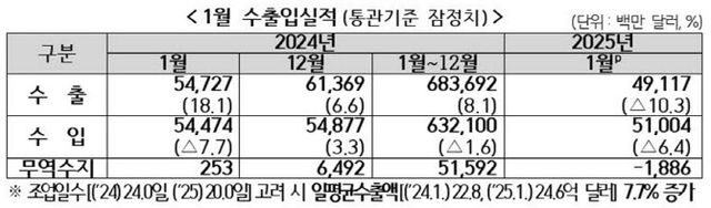 1월 무역수지는 19억달러 적자였다. 수출액이 수입액 대비 크게 줄며 역시 재작년 5월 이후 21개월 만에 무역수지 적자를 기록했다.