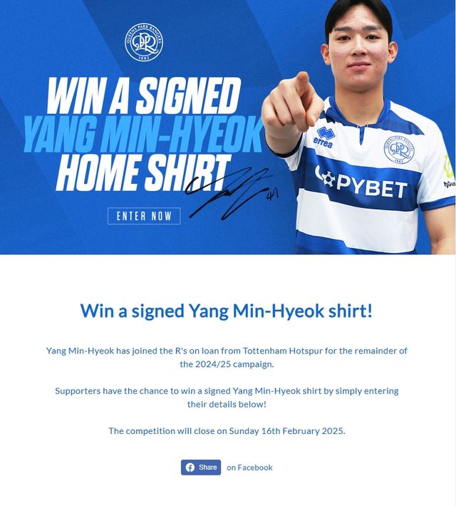 QPR은 지난달 30일(한국시간) 구단 공식 홈페이지를 통해 "서포터들에게 새로 임대된 양민혁 선수의 사인이 있는 유니폼을 받을 기회를 드린다"며 이벤트 개최 소식을 알렸다.