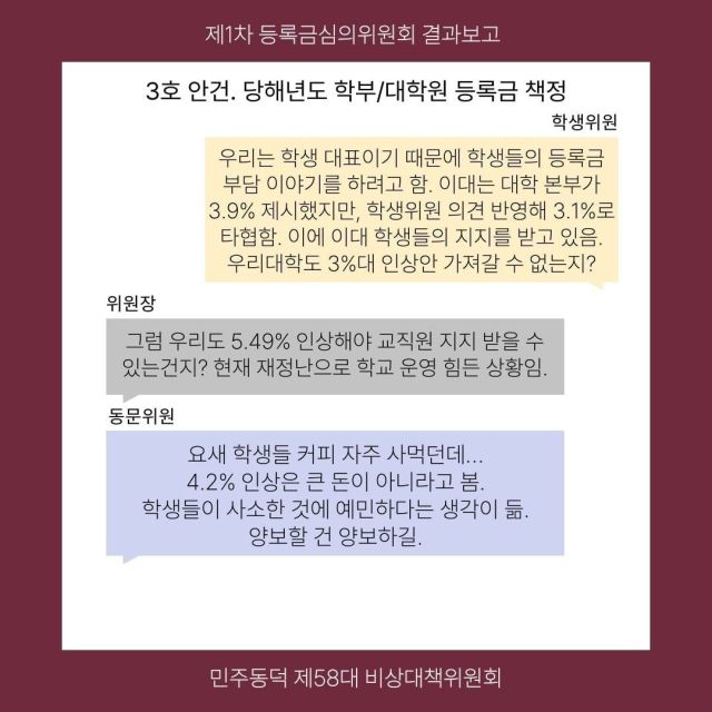 등심위에서는 학생들의 요구를 폄하하는 발언이 나오기도 한다. 동덕여대 비상대책위원회는 지난 21일 등심위 논의과정을 공개하며 동문위원이 등록금 인상률을 낮춰달라는 학생위원들에게 "요즘 학생들 커피 자주 사먹던데" "학생들이 사소한 것에 예민하다"며 양보를 요구했다고 밝혔다. 이날 동덕여대는 학교 위원 3인, 전문가 위원 1인, 동문위원 1인의 찬성으로 학생위원 3인의 반대를 뒤로 한 채 등록금 인상을 결정했다.