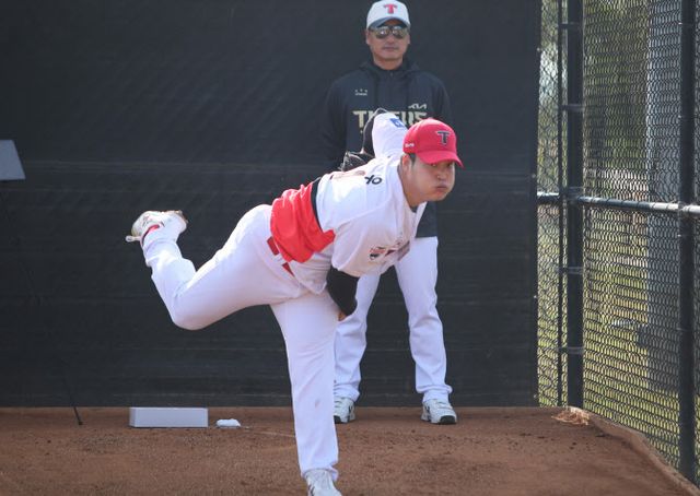 신인 선수 중 유일하게 1군 스프링캠프 명단에 이름을 올린 김태형도 첫 불펜 투구를 소화했다. 직구, 슬라이더, 커브를 섞어 던지며 총 20개 투구를 마치고 마운드를 내려왔다.