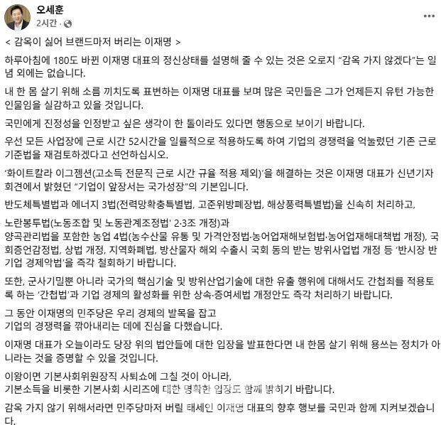 오 시장은 이날 개인 사회관계망서비스(SNS)에 올린 ‘감옥이 싫어 브랜드마저 버리는 이재명’이란 제목의 글에서 “내 한 몸 살기 위해 소름 끼치도록 표변하는 이 대표를 보며 많은 국민들은 그가 언제든지 유턴 가능한 인물임을 실감하고 있을 것”이라며 이같이 비판했다.