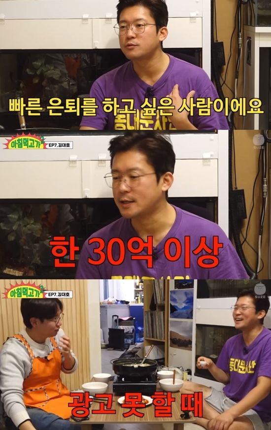 또한 유튜브 채널 '재밌는 거 올라온다'의 '아침 먹고 가'에서 김대호는 "빠른 은퇴를 하고 싶다. 그 방법은 경제적 자유밖에 없다"라며 30억 이상의 수익을 벌고 싶다고 이야기했다. 그러면서 프리 선언을 하고 싶을 때로 '광고 촬영을 하지 못할 때'를 꼽기도 했다.
