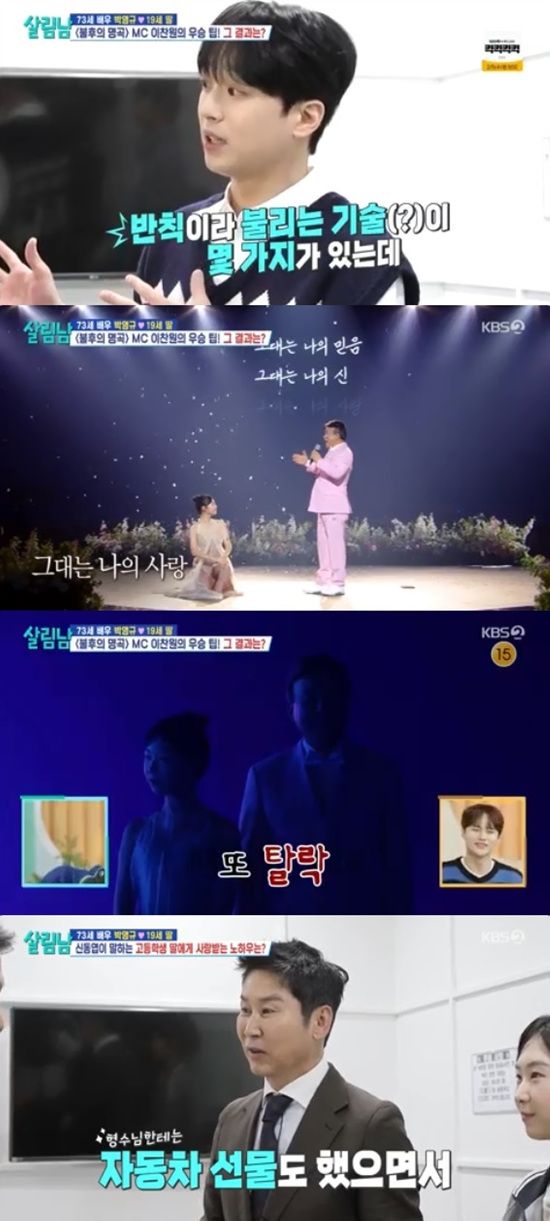 이찬원은 박영규가 우승 팁을 알려달라고 하자 "반칙이라고 불리는 몇 가지가 있다"며 관객 호응 유도, 합창단 대동하기를 알려줬다.