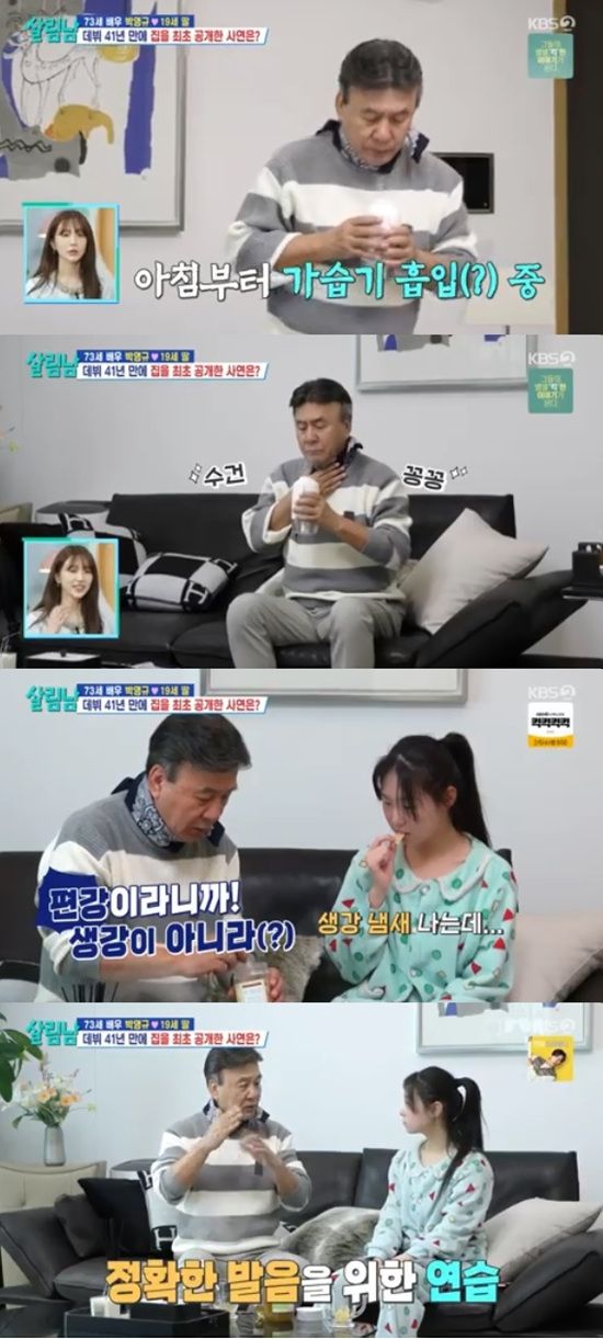 이날 박영규는 딸과의 '불후의 명곡' 출연을 앞두고 목 관리에 집중했다. 박영규는 가습기를 들고 다니며 목에는 수건을 감싸고 있었다.