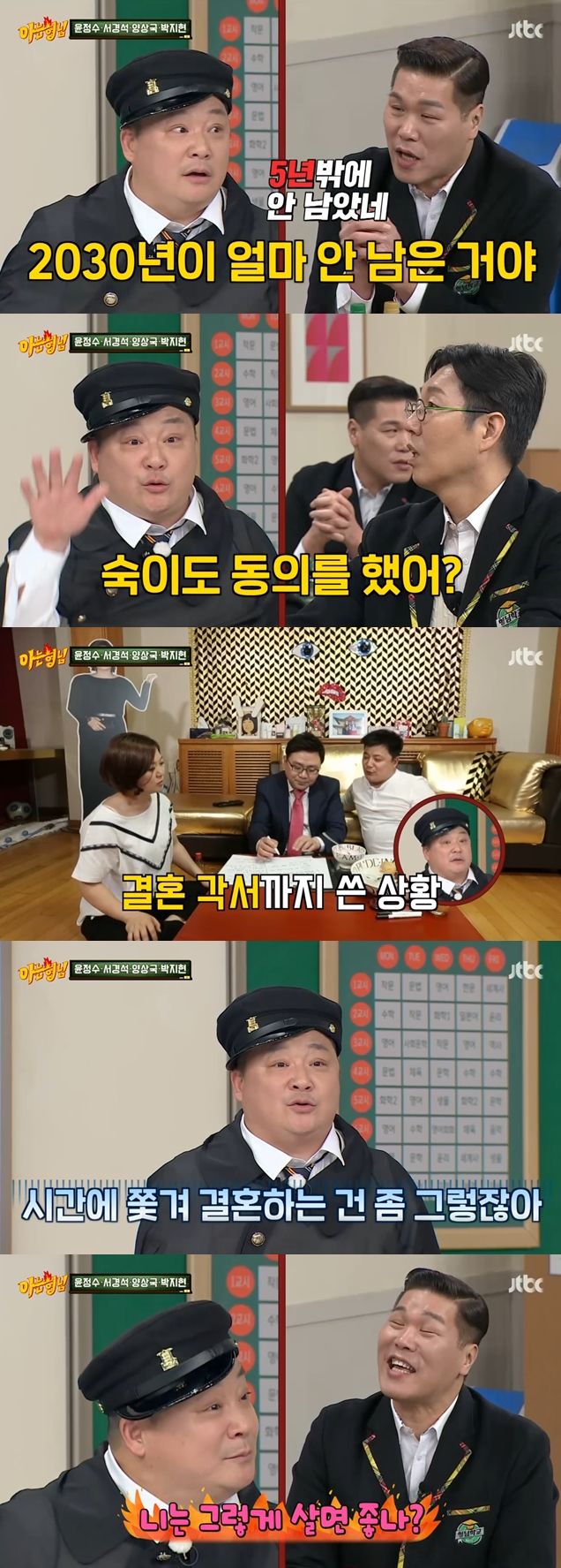 "진짜 결혼 해야하는 거냐"라는 질문이 이어지자 윤정수는 "동료끼리 시간에 쫓겨 결혼하는 건 좀 그렇지 않나"라며 당황해했다.