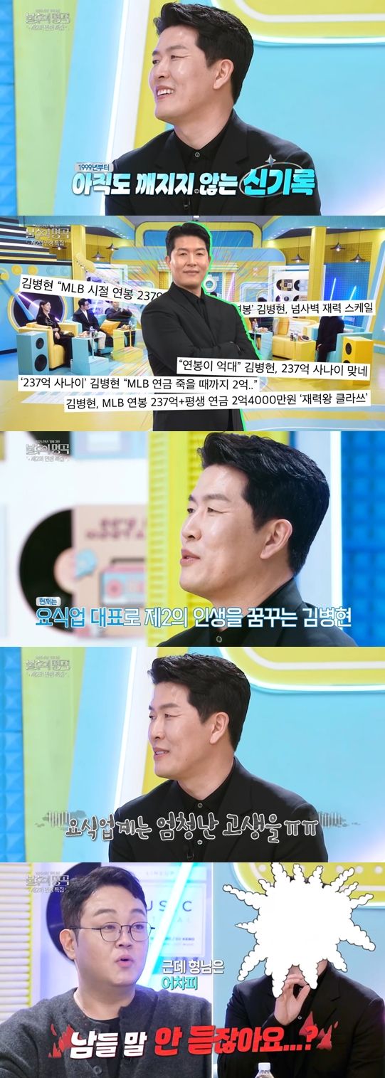 또 이찬원이 "메이저리그에서 일정 경기 이상 뛴 분들은 연금이 나온다"라며 "매년 2억이라던데 맞나"라고 하자, 김병현은 "지금은 1억 좀 더"라고 말해 놀라움을 자아냈다.