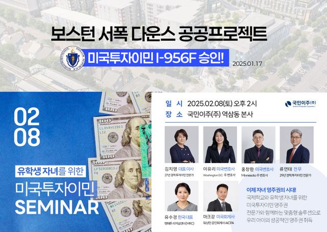 이번 설명회에서는 최근 USCIS의 승인 절차 변화, 유학생 자녀의 영주권 전략, 공공 인프라 프로젝트의 안정성, 그리고 새로운 보스턴 공공 프로젝트, 세법까지 미국 투자이민에 대한 깊이 있는 분석이 진행될 예정이다. 특히, 이번 I-956F 승인 사례를 통해 투자자들이 보다 신뢰할 수 있는 투자 기회를 모색할 수 있도록 실질적인 가이드를 제공할 계획이다.