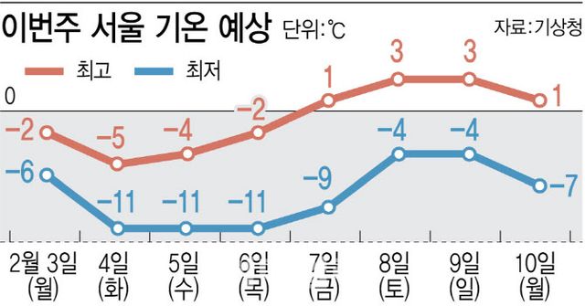 이 같은 추위는 일주일 내내 시민들을 괴롭히다 주말이 돼서야 주춤할 것으로 전망된다. 8~9일 서울의 아침 최저기온은 영하 4도, 낮 최고기온은 3도로 예상된다. 이 기간 건강관리와 동파 방지 등 한파 대비가 필요할 것으로 보인다.