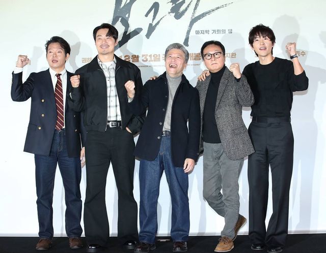 배우 박지환(왼쪽부터)과 이희준, 권해효, 김종수, 송중기가 2024년 12월 19일 서울 강남구 메가박스 코엑스에서 열린 영화 '보고타 : 마지막 기회의 땅' 언론시사회에 참석해 포즈를 취하고 있다. '보고타 : 마지막 기회의 땅'은 IMF 직후, 새로운 희망을 품고 지구 반대편 콜롬비아 보고타로 향한 국희(송중기 분)가 보고타 한인 사회의 실세 수영(이희준 분), 박병장(권해효 분)과 얽히게 되면서 벌어지는 이야기를 그린 작품이다 / 뉴스1