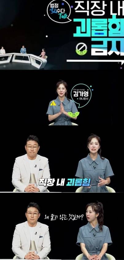 김가영은 "여러분과 함께 직장내 괴롭힘 퀘스천을 열심히 풀어보도록 하겠다. 저와 함께 직장내 괴롭힘 고민 발로 시원하게 뻥"이라고 소개했고, 이후 "직장내 괴롭힘을 향한 시각도 바뀌었고 더 조심하게 됐다는 사람들도 있는데 왜 줄지 않는 걸까요?"라고 묻기도 했다.
