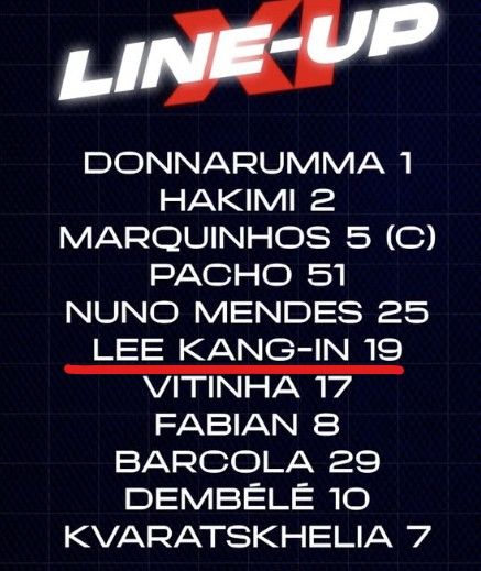 골문은 잔루이지 돈나룸마가 지켰다. 누누 멘데스, 윌리안 파초, 마르퀴뇨스, 아슈라프 하키미가 백4를 형성했다. 2선은 파비안 루이스, 이강인, 누누 멘데스가 나섰다. 최전방 스리톱은 흐비차 크바라츠헬리아, 우스만 뎀벨레, 브래들리 바르콜라로 짜여졌다.