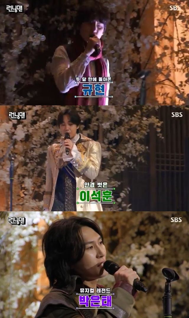 2일 SBS ‘런닝맨’에서는 게스트로 뮤지컬 '웃는 남자'의 박은태, 규현, 이석훈이 등장했다. 이들은 '웃는 남자'의 '그 눈을 떠'를 부르며 등장해 시청자들에 귀호강을 선사했다.