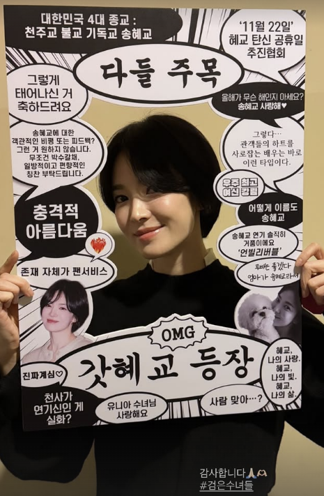 이날 개봉 2주차 무대인사로 관객을 만난 송혜교는 자신의 SNS에 “감사합니다 #검은수녀들”이라는 글과 함께 사진을 공개했다.