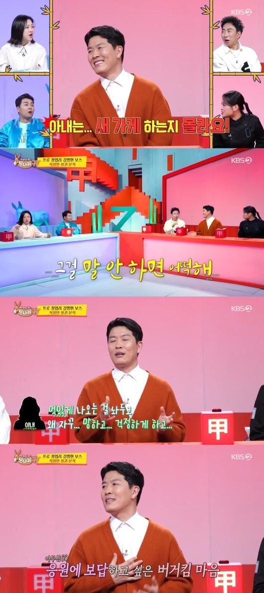 2일 오후 방송된 KBS2 예능 프로그램 ‘사장님 귀는 당나귀 귀’(이하 ‘사당귀’)에서는 김병현과 정호영이 시장을 조사하는 모습이 그려졌다. 이날 방송에서 김숙은 김병현에게 “인건비 줄이게 아내랑 같이 영업하는 건 어때요?”라고 제안했다. 이에 김병현은 “아내는 새 가게 하는지 몰라요. 야구 쪽으로 일했으면 좋겠다고 해요. 멋있게 나오는 걸 놔두고 왜 자꾸 망하는 길로 가냐요”라고 답해 모두를 놀라게 했다.