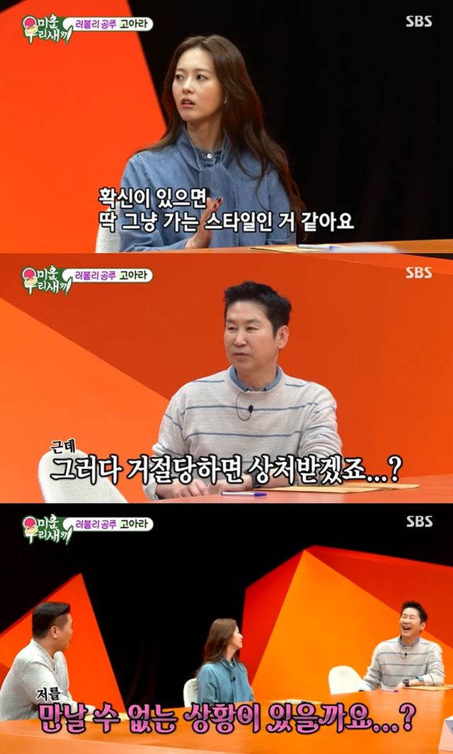 신동엽은 상대가 "미안한데 나 지금 만날 수가 없어"라고 거절 당하면 상처 받지 않냐고 물었고, 고아라는 "만날 수가 없는 상황이 있을까요. 선배님"이라고 말하며 자기애를 뽐냈다.