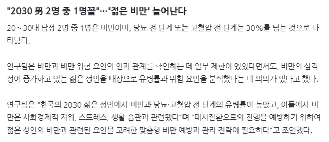 - 한국은 서구보다 비만율이 낮지만, 생활 습관 변화로 비만율이 증가하는 추세입니다.