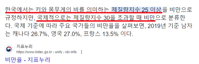 - 반면, 서양 국가에서는 일반적으로 BMI 25 이상이 과체중, 30 이상이 비만으로 간주됩니다.