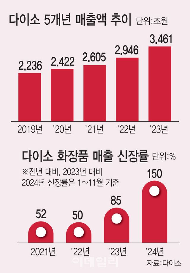 2일 업계에 따르면 다이소 운영사인 아성다이소의 지난해 연매출이 4조원을 돌파했을 것으로 예상된다. 아성다이소는 2019년 매출 2조원을 넘어선 후 4년만에 3조원의 벽을 뚫었다. 연도별 매출액을 보면 △2019년 2조 2362억원 △2020년 2조 4216억원 △2021년 2조 6048억원 △2022년 2조 9458억원 △2023년 3조 4605억원이다. 이후 성장세는 더 가팔라지고 있다.