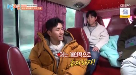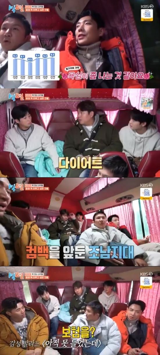 2일 방송된 KBS 2TV '1박 2일 시즌4'에서는 김종민, 문세윤, 조세호, 이준, 딘딘, 유선호가 새해 목표에 대한 얘기를 나누는 모습이 전파를 탔다.