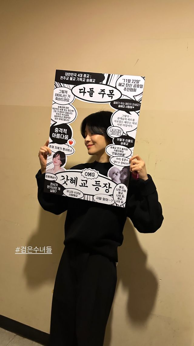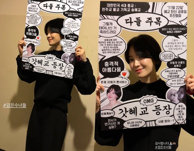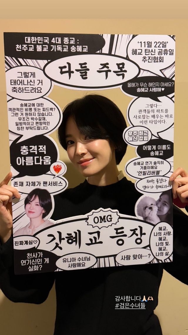 2일 송혜교는 자신의 인스타그램에 "감사합니다. '검은 수녀들'"이라는 글과 함께 사진을 공개했다. 공개된 사진 속에는 영화 '검은 수녀들' 무대인사 현장에 참석한 송혜교의 모습이 담겨있다.