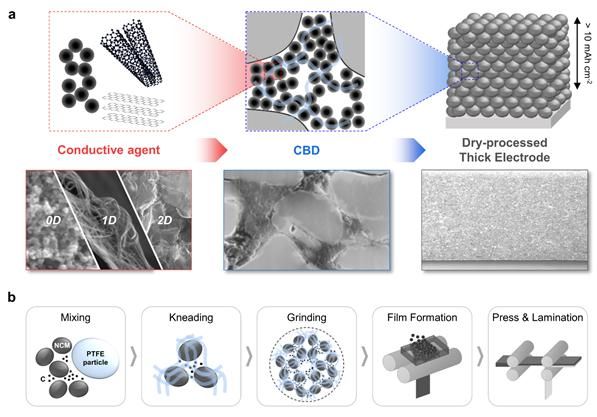 2일 UNIST에 따르면 에너지화학공학과 정경민 교수팀은 건식 공정을 통해 기존보다 5배 두꺼운 배터리 전극을 개발하는 데 성공했다.