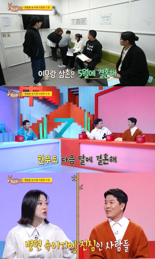 신윤승은 “여자친구는 없다”고 말했고, 조수연은 “이모랑 삼촌은 5월에 결혼한다”고 말해 눈길을 끌었다. 스튜디오에서 이를 지켜보던 김병현은 “진짜?”라며 놀라워했고 박명수는 “현무도 다음 달에 아나운서랑 결혼한다”고 말했다.