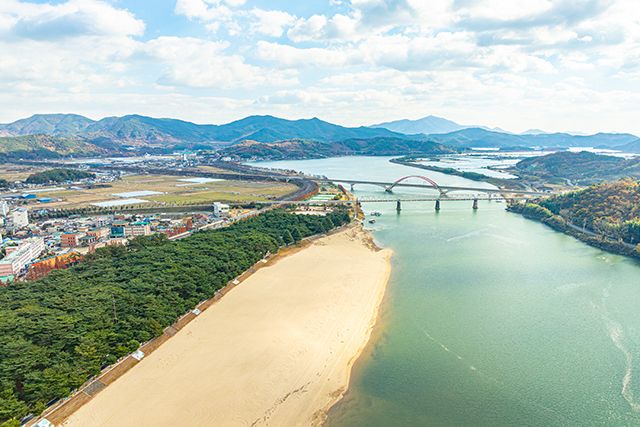 사시사철 초록빛을 유지하는 하동송림공원과 함께 이색적인 풍경을 만들어내고 있다. 섬진강 모래사장은 방문객들 사이서 맨발 걷기 명소로 손꼽힌다. 신발은 물론, 양말까지 벗고 바지를 살짝 걷은 뒤 강가를 따라 걸어 보자. 부드러운 모래와 시원한 강물은 발끝으로부터 온몸으로 활기를 공급한다. 탁 트인 하늘이 하동송림공원의 빼곡한 숲과는 사뭇 다른 풍경을 선사한다.